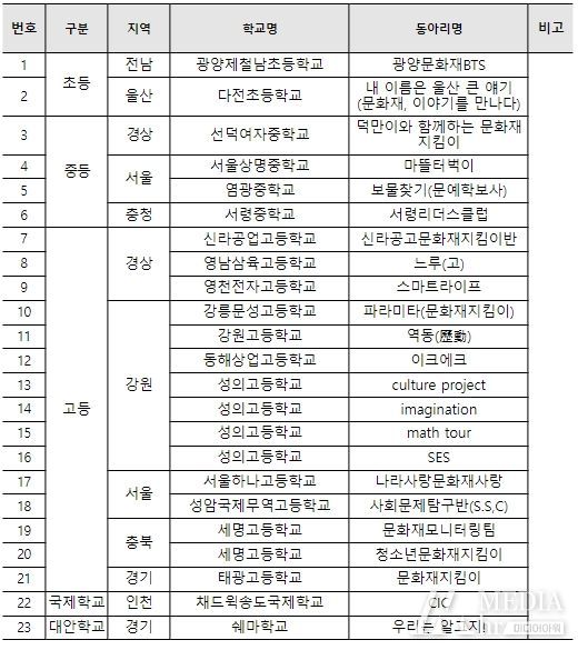 미디어아워 최태문 기자 | 문화재청은 지속가능한 문화유산 보호 및 미래 인재 육성을 위한 2023년 ‘청소년문화재지킴이 학교(동아리) 지원 사업’의 지원 대상 학교(동아리) 23곳을 선정했다.