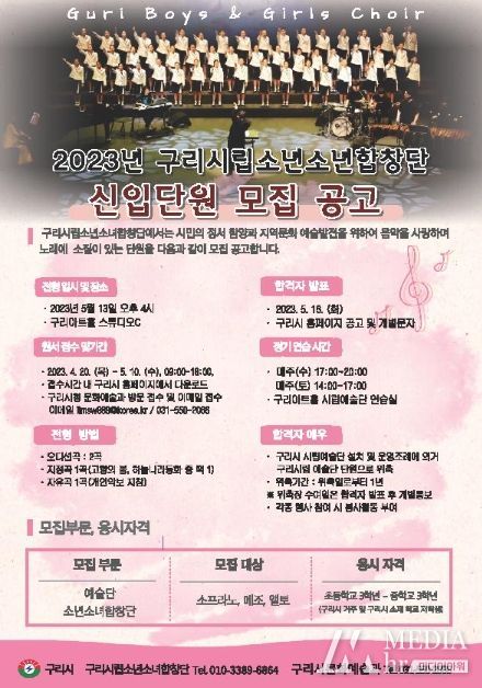 한편 구리시립소년소녀합창단 응모원서는 구리시청 홈페이지에서 받아 볼 수 있으며, 자세한 사항은 구리시 문화예술과로 문의하면 된다.