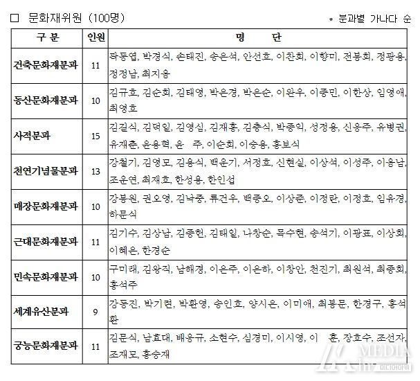 또한, 문화재위원 구성을 다양화 하고 각 지역 정책 현장의 목소리를 보다 충실하게 수렴할 수 있도록 비수도권 위원의 비중을 과거 55%(55명)에서 62%(62명)로 상향했다. 그리고 신규위원 위촉 비중도 지난 44%(44명)에서 48%(48명)로 조정하여 보다 균형있게 신·구 조화를 이룰 수 있도록 구성했다.