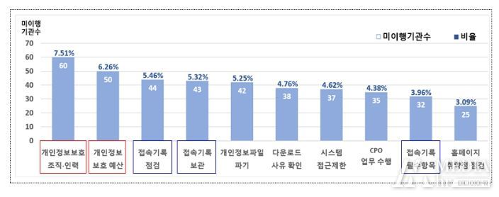 정량지표는 80점 만점 대비 77점 수준으로 법적 의무사항을 대체로 준수하고 있으며 기관 유형별 편차도 크지 않아 전체적으로 상향 평준화됐다. 다만, 미이행률이 높은 하위 10개 항목 분석 결과 개인정보처리시스템 접속기록 관련 3개 항목, 보호 인력·예산 등 관리 기반 2개 항목, 개인정보 파기와 내려받기(다운로드) 사유 확인 미비 등이 개선과제로 도출됐다.