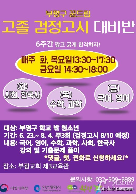미디어아워 기자 | 인천시 부평구 학교밖청소년지원센터가 제2회 고졸 검정고시 대비반을 개강한다.