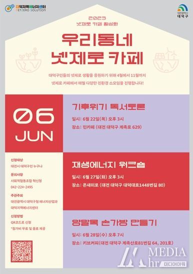 대덕구의 넷제로 카페와 함께 재생에너지 확산과 친환경 생활 실천을 주제로 구민들에게 다양한 참여의 기회를 제공하고자 6월에는 △기후위기 독서토론(6월 22일 오후 3시, 법동 민카페:계족로629) △재생에너지 워크숍(6월 27일 오후 3시, 목상동 온새미로:대덕대로 1448번길 80) △양말목 손가방 만들기 원데이클래스(6월 28일 오후 7시, 송촌동 키브커피:계족산로81번길64, 201호)를 진행한다.