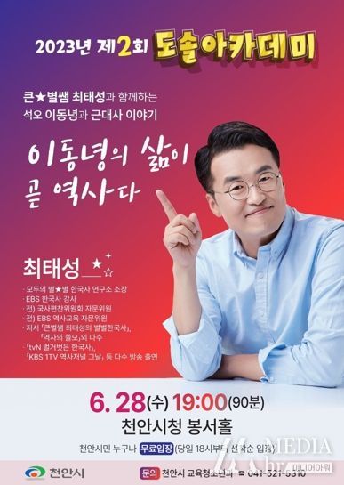 미디어아워 기자 | 천안시는 오는 28일 오후 7시 시청 봉서홀에서 ‘이동녕의 삶이 곧 역사다’라는 주제로 최태성 한국사 강사를 초청해 도솔아카데미 강연을 진행한다.