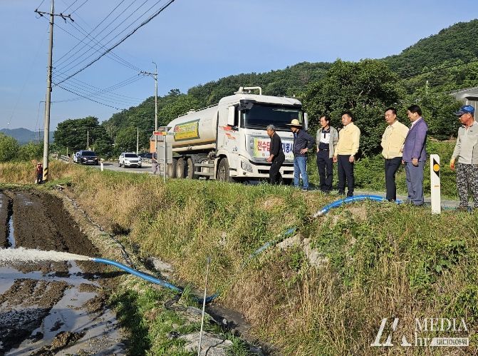 이날 행사는 이른 오전부터 대술면 시산리 152번지 논 7500㎡에서 진행됐으며, 한돈협회 소속 살수차를 활용해 농업용수 약 120톤을 공급했다.