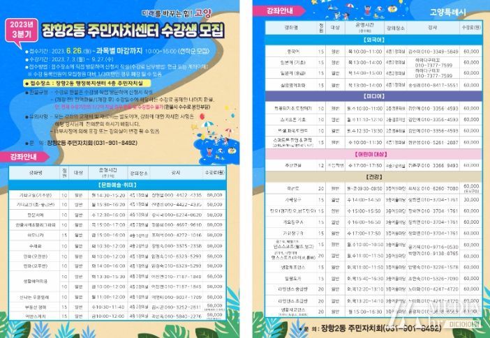 미디어아워 기자 | 고양특례시 장항2동 주민자치회는 오는 6월 26일부터 30일까지 2023년 3분기 문화강좌 프로그램 수강생을 모집한다.