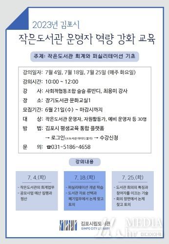 미디어아워 기자 | 김포시 시립도서관은 관내 사립작은도서관 운영 활성화 사업을 위한 계획의 하나로 ‘작은도서관 운영자 역량 강화 교육’을 실시한다.