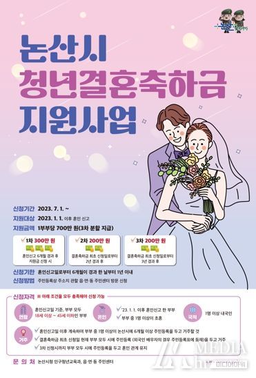 미디어아워 기자 | 논산시가 청년층의 혼인을 장려하고 나아가 신혼부부의 경제적 부담을 완화하고자 ‘청년결혼축하금’ 정책을 도입, 7월 초부터 본격 추진에 나선다.