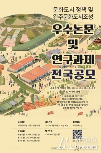 미디어아워 기자 | 완주문화도시지원센터는 6월부터 오는 10월 16일까지 문화도시와 관련한 이슈와 쟁점, 확장된 정책 제안 등을 모으기 위한 ‘문화도시 정책 및 완주문화도시조성을 위한 우수논문 및 연구과제’를 공모한다.