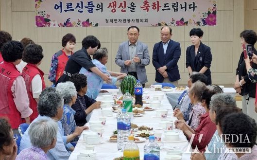 미디어아워 기자 | 청덕면 자원봉사협의회는 23일 청덕면사무소 2층 회의실에서 관내 어르신 20여 분을 모시고 생신상 차려드리기 행사를 진행했다.