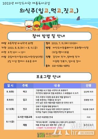미디어아워 기자 | 김포시 마산도서관은 올 여름방학 기간 중인 8월 8일부터 11일까지 나흘에 걸쳐 매일 오전 10시에서 12시, 김포시 초등학교 4~6학년을 대상으로 여름독서교실 ‘의식주(입고.먹고.짓고.)’를 운영한다.