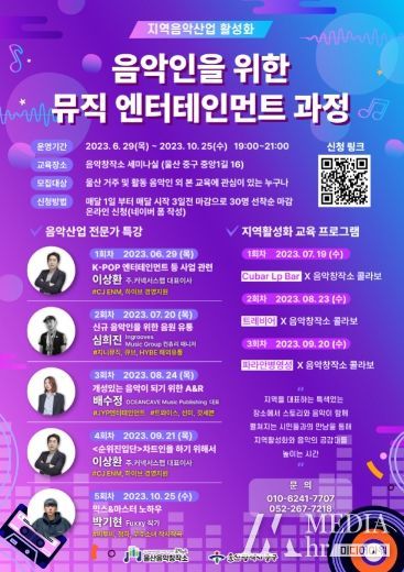 미디어아워 기자 | 울산 중구문화의전당(관장 한은숙)에서 운영하는 울산음악창작소가 6월 29일부터 10월 25일까지 음악 산업 전문 교육인 ‘2023 전문가 특강’을 개최한다.