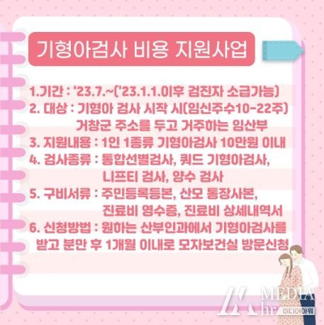 미디어아워 기자 | 거창군은 건강한 자녀 출산과 출산가정의 경제적 부담 경감을 위해 기형아검사 비용 지원사업을 7월부터 운영한다.