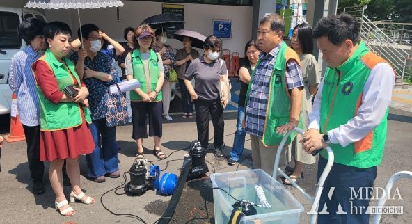 이어서 이규삼 하안2동 자율방재단 대표가 수중펌프 사용 시범을 보이고 참석자가 직접 작동해 보며 실제 상황에 대비하는 실질적인 교육을 진행했다.