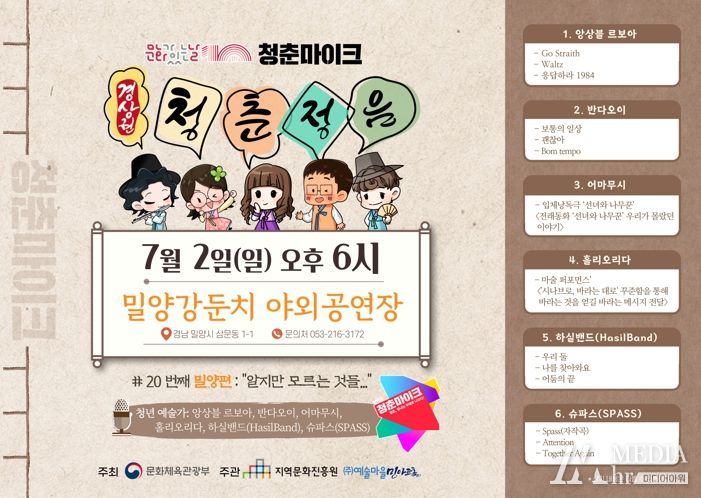 미디어아워 기자 | 2023년 문화가 있는 날 청춘마이크 경상권 공연이 7월 2일 오후 6시 밀양강둔치 야외공연장에서 열린다.