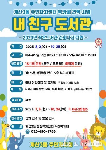 미디어아워 기자 | 인천시 계양구 계산3동 주민자치회는 관내 어린이집과 유치원을 대상으로 오는 7월 3일부터 10월 24일까지 도서관 견학 사업 ‘내 친구 도서관’ 프로그램의 참여자를 모집한다.