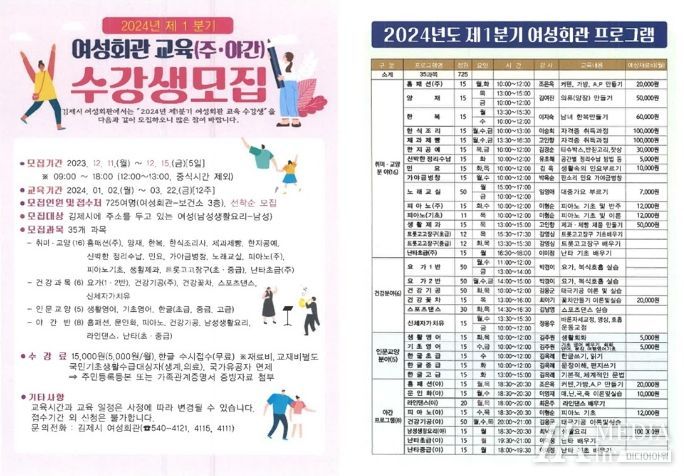미디어아워 임다연 기자 | 김제시는 오는 11일부터 15일까지 2024년도 제1분기 여성회관 수강생을 모집한다.