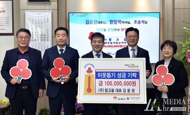 미디어아워 임다연 기자 | 김제시는 순동 산업단지에 위치한 ㈜참고을(대표 김윤권)에서 관내 사회복지시설과 저소득 가정을 위해 써달라며 이웃돕기성금 1억원을 기탁하며 나눔을 통해 사랑의 온도를 올리는‘희망2024 나눔캠페인’에 동참했다고 밝혔다.