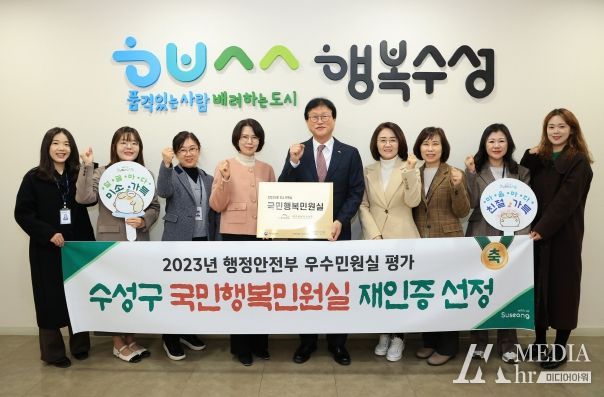 미디어아워 임다연 기자 | 대구 수성구는 ‘2023년 국민행복민원실’ 우수민원실 인증현판을 구청 종합민원실 입구에 게시했다고 10일 밝혔다.