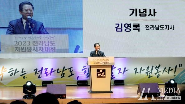미디어아워 임다연 기자 | 전라남도는 12일 도청 김대중강당에서 올 한해 따뜻한 나눔봉사를 실천한 자원봉사자를 격려하고 자긍심을 높이기 위해 60만 자원봉사자 화합의 장인 ‘2023 전라남도 자원봉사자 대회’를 개최했다.