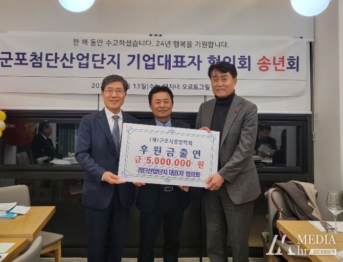 미디어아워 임다연 기자 | 군포 첨단산업단지 대표자협의회는 13일 2023년 한해를 마무리 하는 송년회 자리에서 회원들의 뜻을 모아 (재)군포사랑장학회에 인재육성을 위한 500만원의 장학금 출연식을 가졌다.