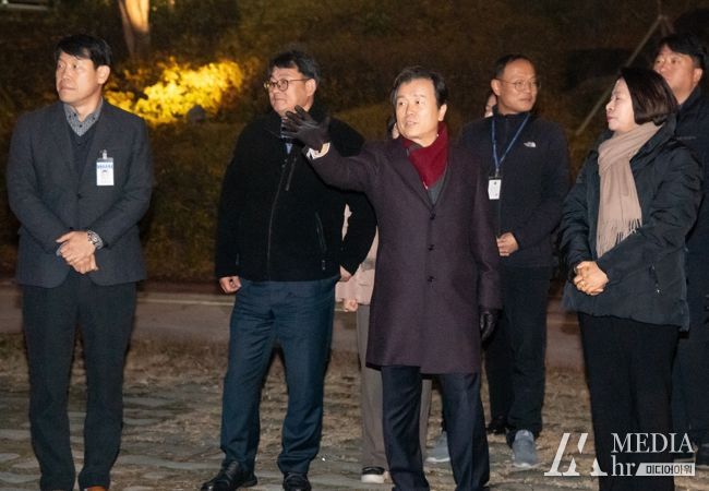 미디어아워 임다연 기자 | 조규일 진주시장은 지난 13일 진주성 촉석문 아래 옹벽 정비 후 설치된 경관조명 준공에 앞서 공무원 등 관계자 10여 명과 함께 현장을 찾아 최종 점검했다.