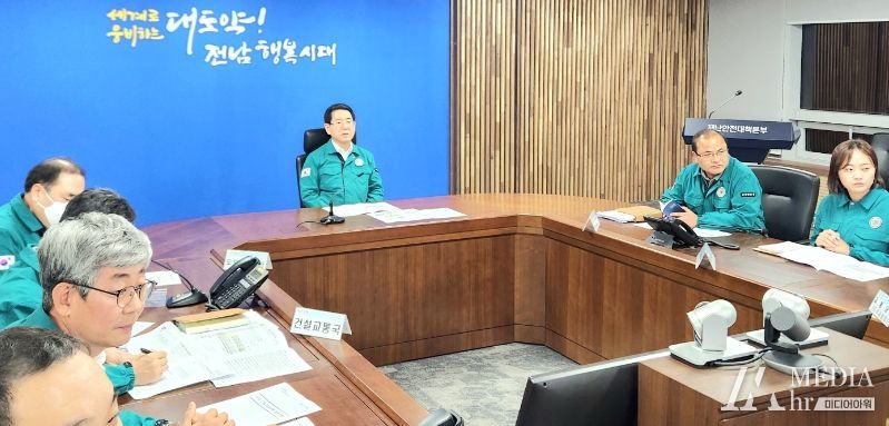 미디어아워 임다연 기자 | 김영록 전라남도지사는 도내 전역에 한파와 대설주의보가 발효된 16일 밤 20시경 대설․한파 대비 재난 대책회의를 긴급 소집해 도로제설, 취약계층 특별관리, 동파대비 철저 등을 당부했다.