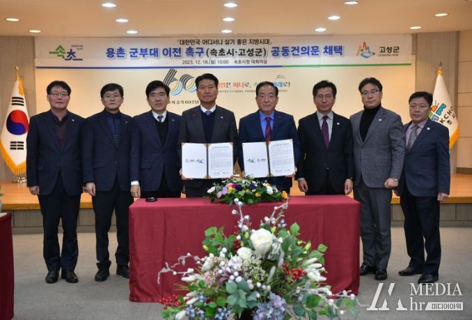 미디어아워 임다연 기자 | 이병선 속초시장과 함명준 고성군수는 18일 속초시청 대회의실에서 고성군 용촌 군부대 이전을 촉구하는 공동 건의문에 서명하고 공동 대응에 나섰다.