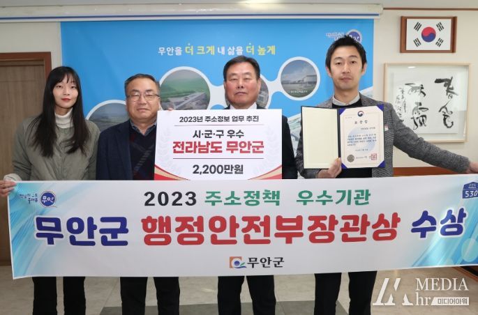 미디어아워 임다연 기자 | 전남 무안군(은 ‘2023년도 주소정책 업무추진 우수기관’으로 선정되어 행정안전부장관 표창을 수상하고, 부상으로 특별교부세 2,200만 원을 받았다고 밝혔다.