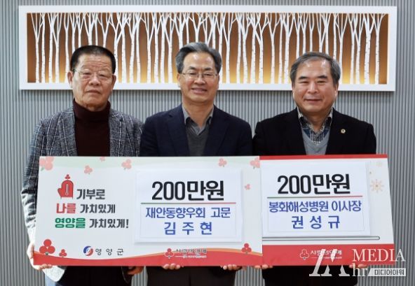 미디어아워 임다연 기자 | 봉화해성병원 이사장 권성규(전 재안동향우회장)씨와 재안동향우회 고문 김주현씨는 19일 영양군에 '희망2024나눔캠페인'성금 400만 원을 전달했다.