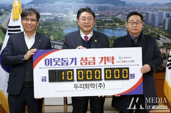 미디어아워 임다연 기자 | 김해시는 20일 두리화학(주)(대표 최백규)에서 어려운 이웃을 위해 써달라며 성금 1,000만원을 기탁했다고 밝혔다.
