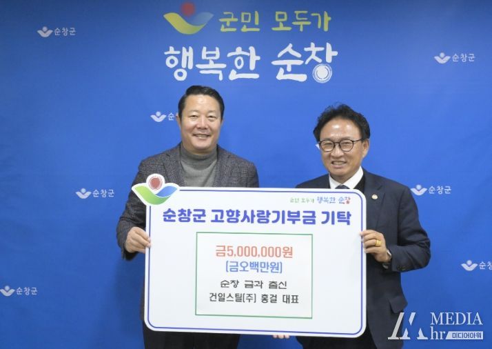 미디어아워 임다연 기자 | 순창군은 건일스틸 주식회사 홍걸 대표(순창 금과면 출신)가 순창군에 고향사랑기부금 최고액인 500만원을 기탁했다고 21일 밝혔다.