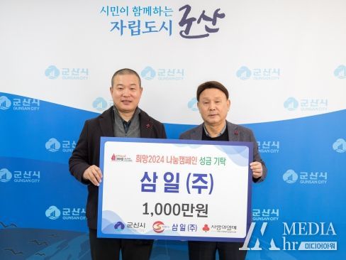 미디어아워 임다연 기자 | 삼일(주)에서 지난 22일 관내 저소득 취약계층의 따뜻한 겨울나기를 지원하기 위해 1,000만원을 군산시에 전달하며 희망2024나눔캠페인 기부 행렬에 동참했다.