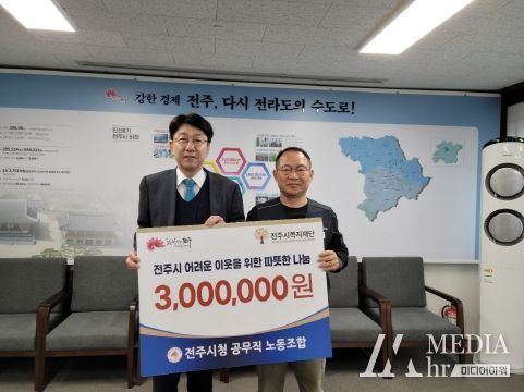 미디어아워 임다연 기자 | 전주시청공무직노동조합은 27일 전주시장실에서 어려운 이웃을 위해 써달라며 전주시복지재단 ‘전주사람’에 후원금 300만 원을 전달했다.