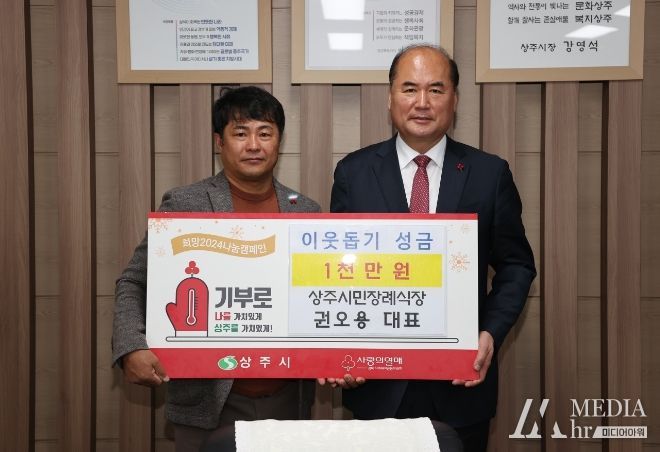 미디어아워 임다연 기자 | 상주시민장례식장(은 12월 27일 연말에 소외된 이웃을 위한 지역 내 사랑 나눔확산과 지역기업의 사회적 책임강화 차원으로 ‘희망2024 나눔캠페인’ 이웃돕기 성금 1,000만 원을 신흥동 행정복지센터(동장 이종진)에 기탁했다.
