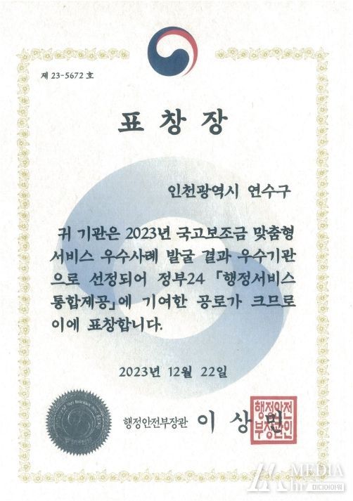 미디어아워 임다연 기자 | 인천시 연수구가 보조금24 이용 활성화 우수 지자체로 선정되어 ‘2023년 디지털정부 혁신 유공’ 행정안전부 장관 표창을 받았다.