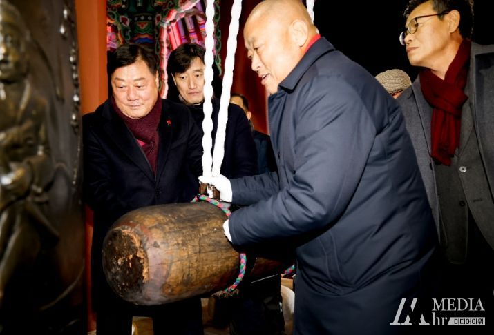 미디어아워 임다연 기자 | 합천군은 지난달 31일 새해의 시작을 알리는 제야 군민대종 타종행사에서 김윤철 합천군수, 조삼술 합천군의회의장, 지정도 재외향우연합회장을 비롯한 기관 단체장이 참석한 가운데 총 33회 타종을 통해 합천군의 발전과 합천군민들의 희망찬 새해를 염원했다.