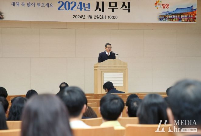 미디어아워 임다연 기자 | 밀양시는 2일 시청 대강당에서 본청 전 직원, 직속기관 담당주사 이상, 읍면동장 및 산하기관 팀장급 이상 직원 등 300여 명이 참석한 가운데 2024년 시무식을 가졌다.