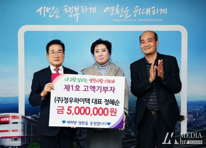 미디어아워 임다연 기자 | 영천시는 지난 2일 ㈜정우하이텍 정혜순 대표, ㈜우리시스 조영원 회장과 시장실에서 고향사랑기부금 기탁식을 가졌다고 밝혔다.