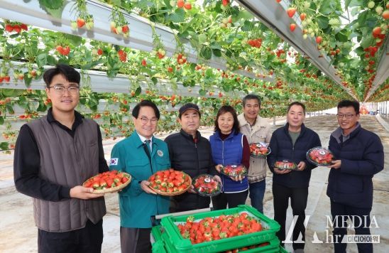 미디어아워 임다연 기자 | 청도군은 12일 맛과 향이 뛰어난 명품 청도딸기의 본격적인 출하를 앞두고, 청도읍 사촌리 소재 하이베드 딸기 재배농가를 방문하여 격려했다고 밝혔다. 농장주인 김창섭(31) 씨는 스마트팜청년보육사업을 통해 딸기재배기술을 배웠다. 이후, 하이베드단지조성지원사업을 통해 약 900평 규모의 단지를 조성하여 매년 24톤의 딸기를 생산하고 약 2억 4천만 원의 조수입을 올리는 청년 선도농가로 거듭났다.