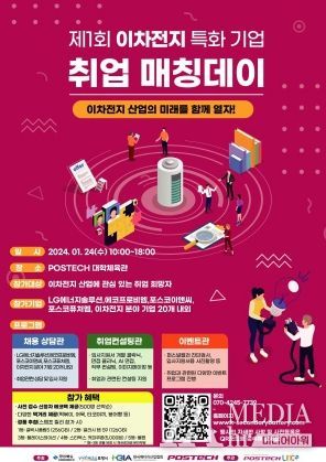 미디어아워 임다연 기자 | 포항시와 포스텍은 오는 24일 포스텍 실내체육관에서 이차전지 관련 분야에 대한 양질의 일자리 정보를 제공하는 ‘제1회 이차전지 특화기업 취업 매칭데이’를 개최한다.