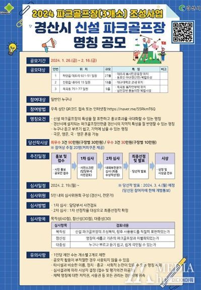 미디어아워 임다연 기자 | 경산시가 최근 3세대 스포츠로 주목받고 있는 파크골프의 저변을 확대하기 위해 시행하는 신설 파크골프장(3개소) 조성사업과 관련해 '경산시 신설 파크골프장 명칭 공모'를 진행한다.