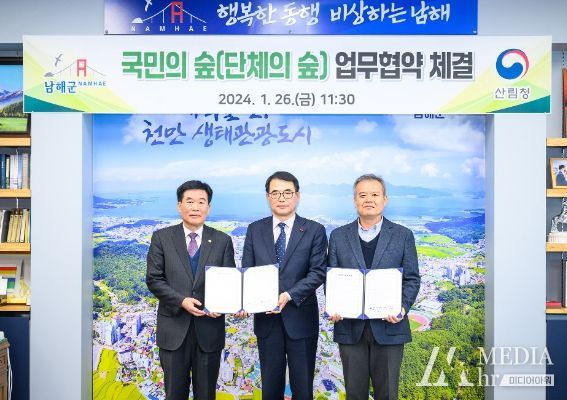 미디어아워 임다연 기자 | 남해군은 26일 군수실에서 서부지방산림청(함양국유림관리소)과 함께 ‘국민의 숲(단체의 숲) 업무협약식’을 개최했다.