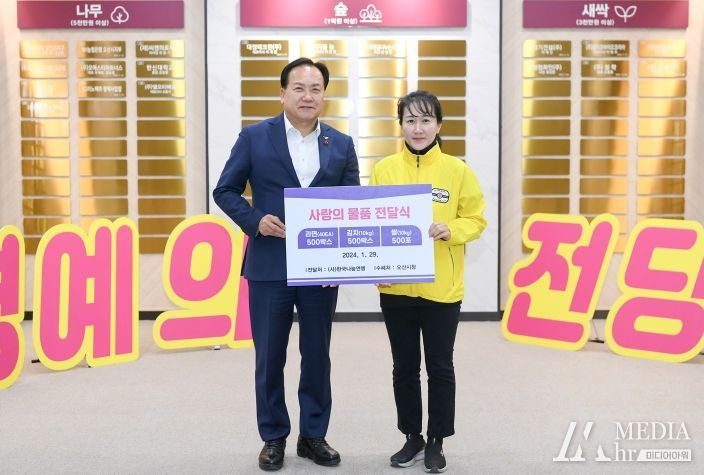 미디어아워 임다연 기자 | (사)한국나눔연맹이 지난 29일 오산시청을 방문해 백미10kg 500포, 김장김치 10kg 500박스, 라면 500박스 등 5천만 원 상당의 후원 물품을 기탁했다.