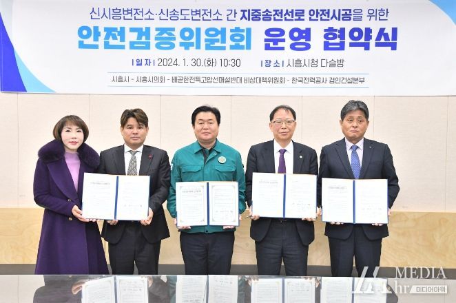 미디어아워 임다연 기자 | 시흥시가 지난 30일 시청 다슬방에서 시의회, 배곧 한전 특고압선 매설 반대 비상대책위원회, 한국전력공사 경인건설본부와 함께 ‘시흥-인천 전력구 공사 관련 안전검증위원회 운영’ 협약식을 열었다.