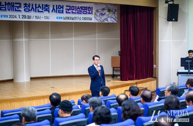 미디어아워 임다연 기자 | 남해군은 29일 남해마늘연구소 대회의실에서 ‘남해군 청사신축 사업 군민설명회’를 개최하고, 그간 추진사항과 변경된 설계안 등을 설명했다.