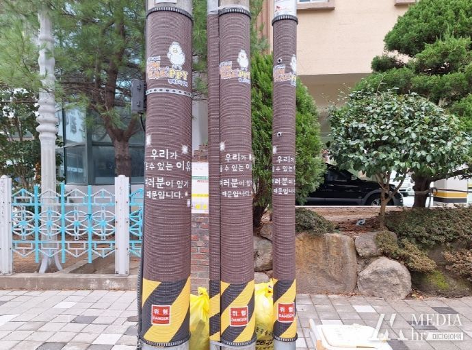 센터는 3000만원을 들여 1월 한 달간 여러 상점이 늘어선 흥동로 일대 양방향 각 1.63km 구간 전신주 223개, 가로등 31개 총 254개에 불법 광고물 부착방지판을 설치했다.