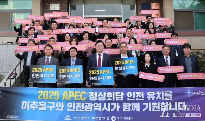 미디어아워 임다연 기자 | 인천 미추홀구는 4일 확대 간부회의를 마친 후 간부 공무원 40여 명이 모여 2025 아시아·태평양 경제협력체(APEC) 정상회의 인천 유치 홍보 캠페인을 전개했다.