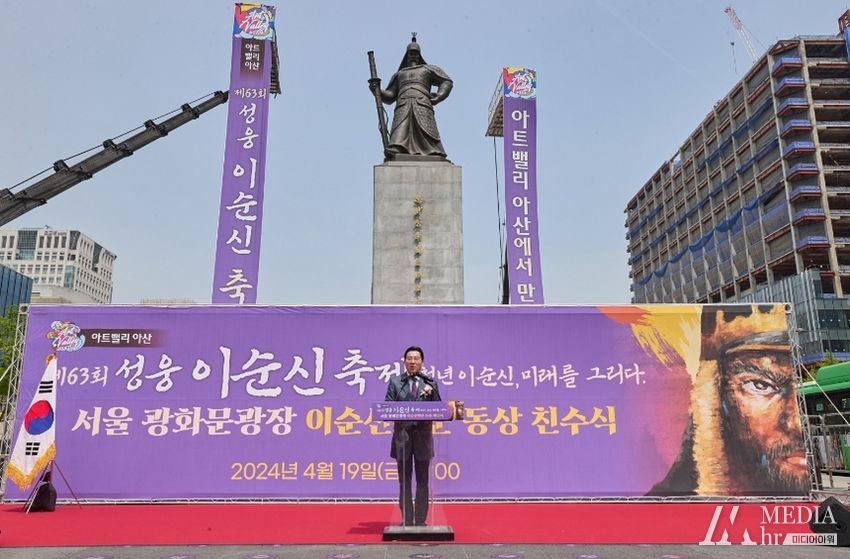 미디어아워 임다연 기자 | 충무공 이순신 장군 탄신 제479주년을 9일 앞둔 19일, 아산시가 서울 광화문광장에서 이순신 장군 동상 친수식을 거행했다.