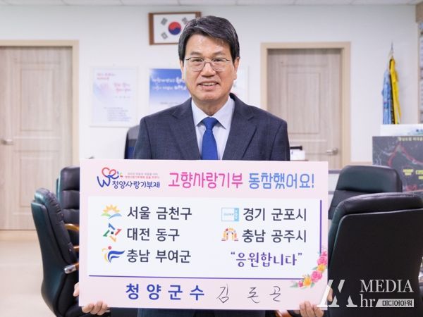 미디어아워 임다연 기자 | 김돈곤 청양군수가 지난 23일 고향사랑기부금을 인터넷 고향사랑e음을 통해 군과 자매도시를 맺고 있는 서울 금천구, 경기 군포시, 대전 동구와 공주·부여·청양생활권협의회인 공주시와 부여군에 각각 기부를 실천했다.