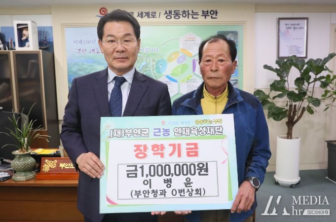 미디어아워 임다연 기자 | 부안청과 0번상회를 운영하고 있는 이병윤 대표는 지난 22일 부안군 근농인재육성재단을 방문하여 지역인재육성을 위해 써달라며 장학금 100만원을 기탁했다.